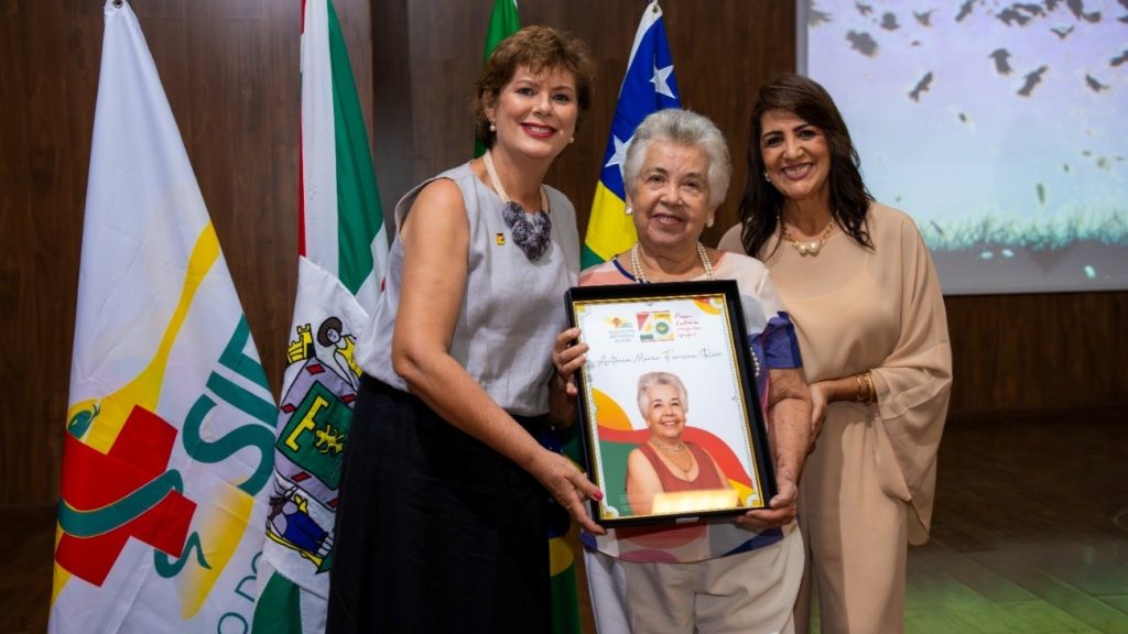 Da esquerda para a direita: Maria Márcia Bachion, presidente da Associação Brasileira de Enfermagem Seção Goiás (ABEn GO), Antônia Maria Ferreira Reis, homenageada pelo SIEG, e Dionne Hallyson – presidente SIEG.