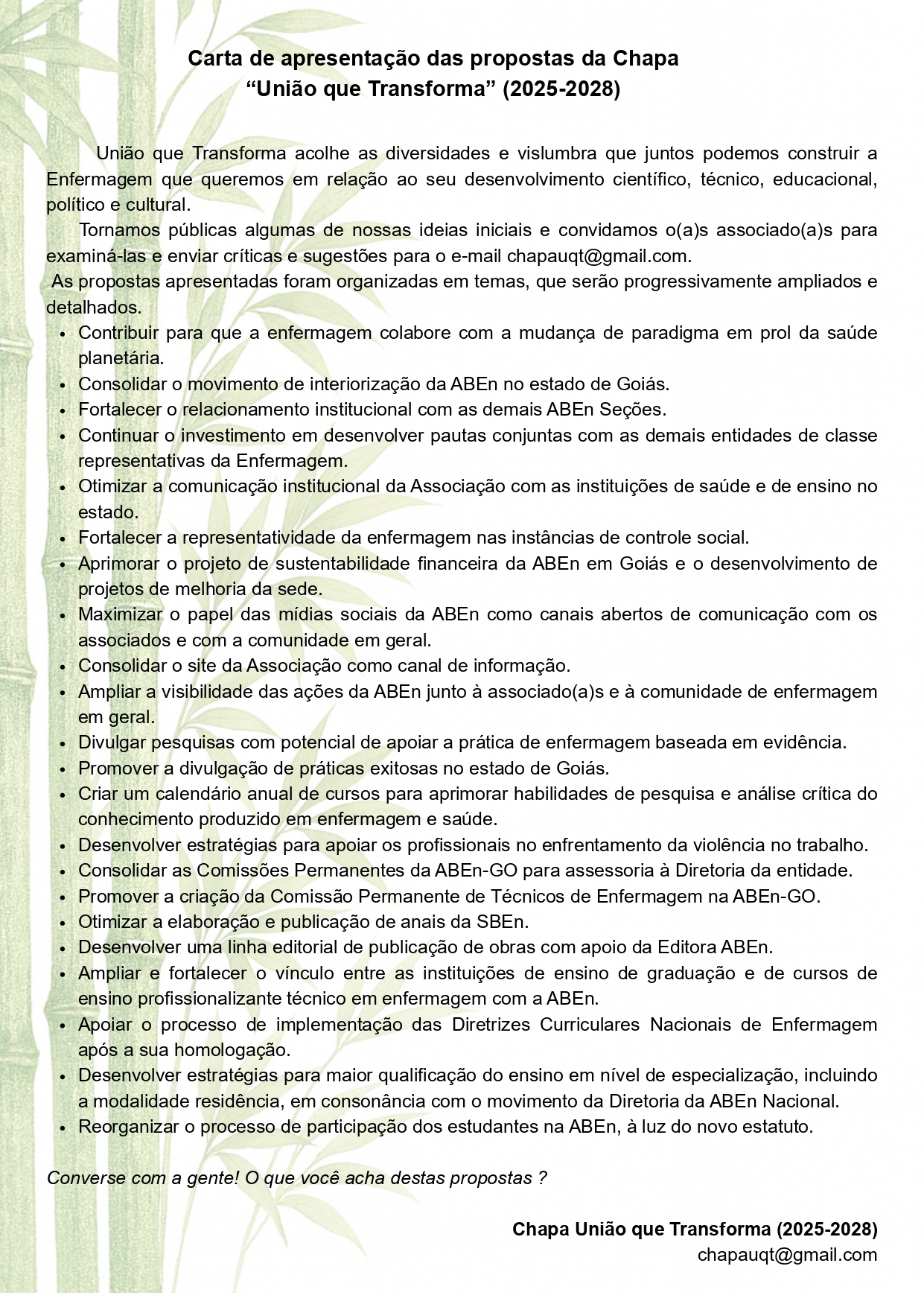 Carta Apresentação da Chapa concorrente a ABEn GO 2025